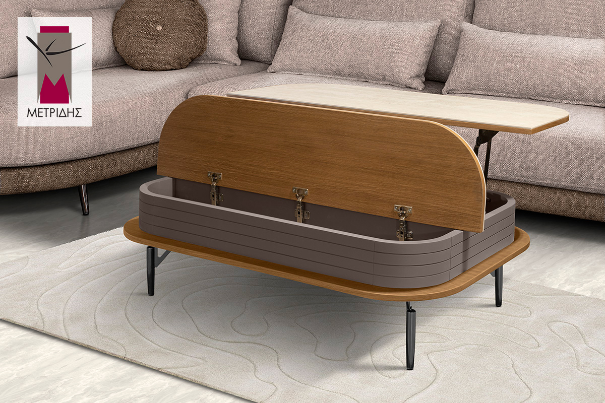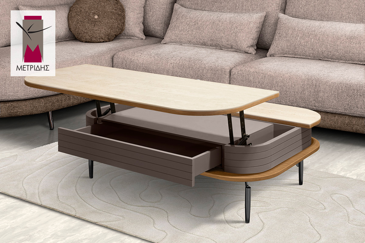Το τραπεζάκι διαθέτει μηχανισμό ανύψωσης σερβιτόρου με soft close, ο οποίος επιτρέπει την εύκολη ανύψωση του καπακιού για πιο άνετο σερβίρισμα ή καθημερινή χρήση. Παράλληλα, περιλαμβάνει ενσωματωμένο συρτάρι αποθήκευσης, ιδανικό για την οργάνωση μικροαντικειμένων και την καλύτερη αξιοποίηση του χώρου.