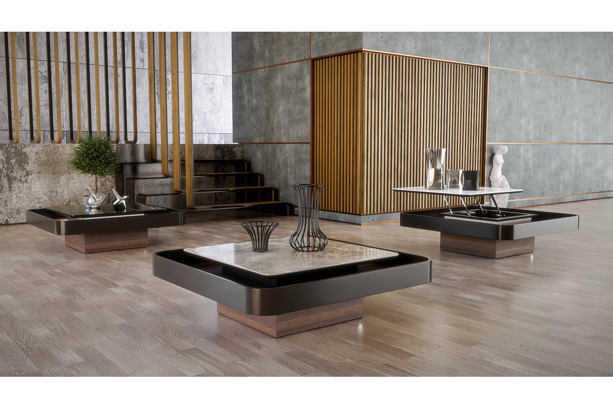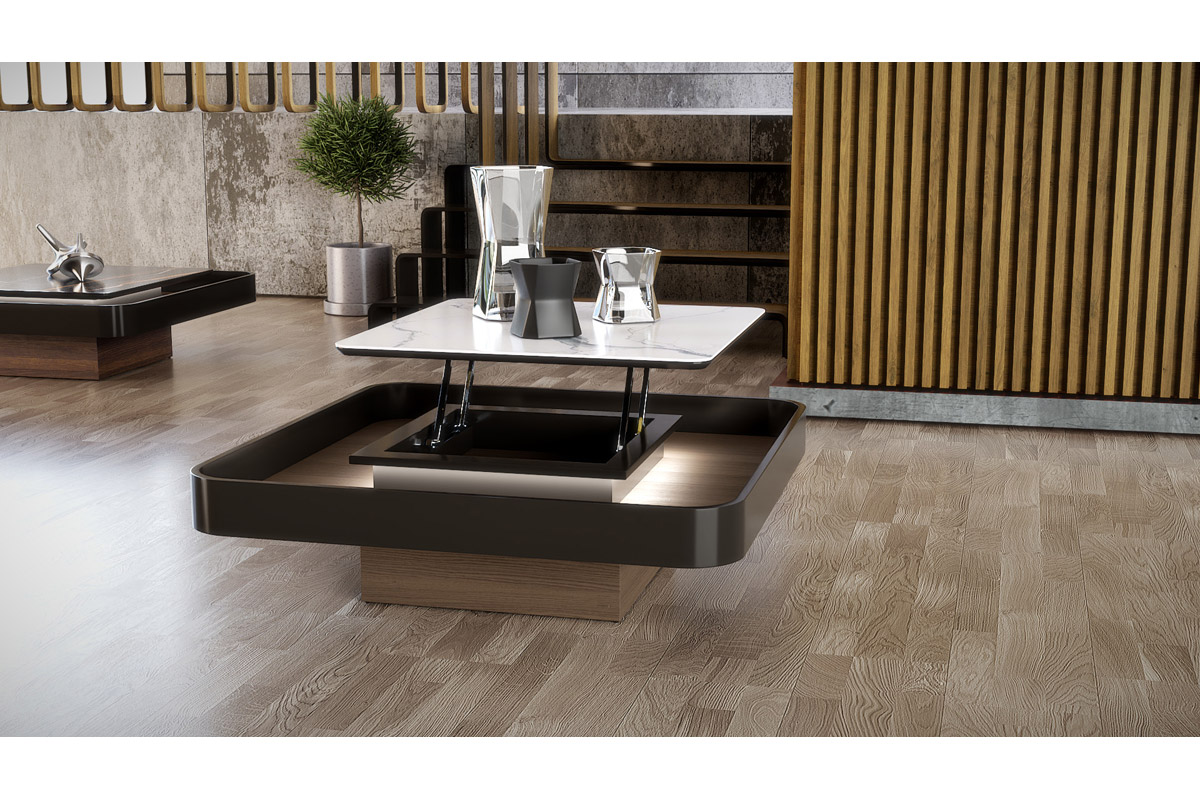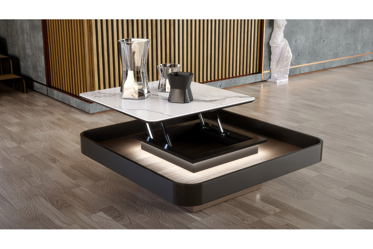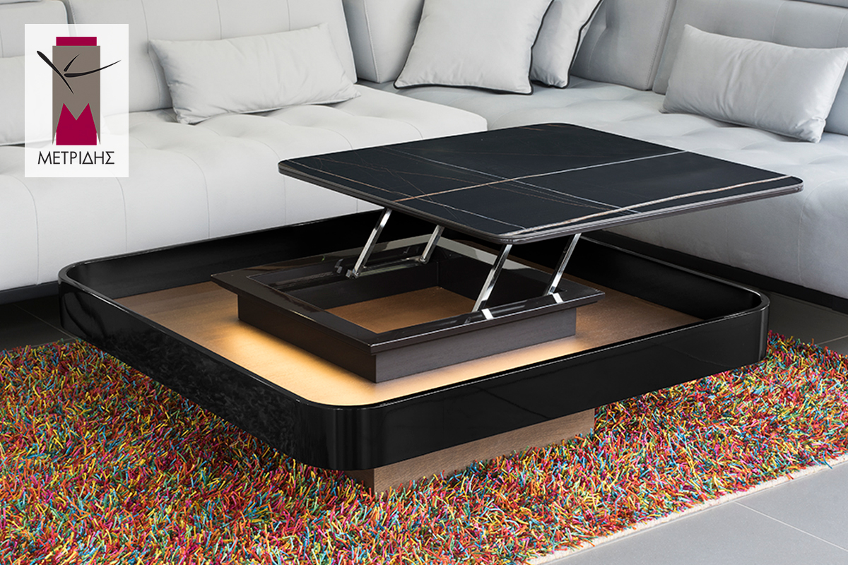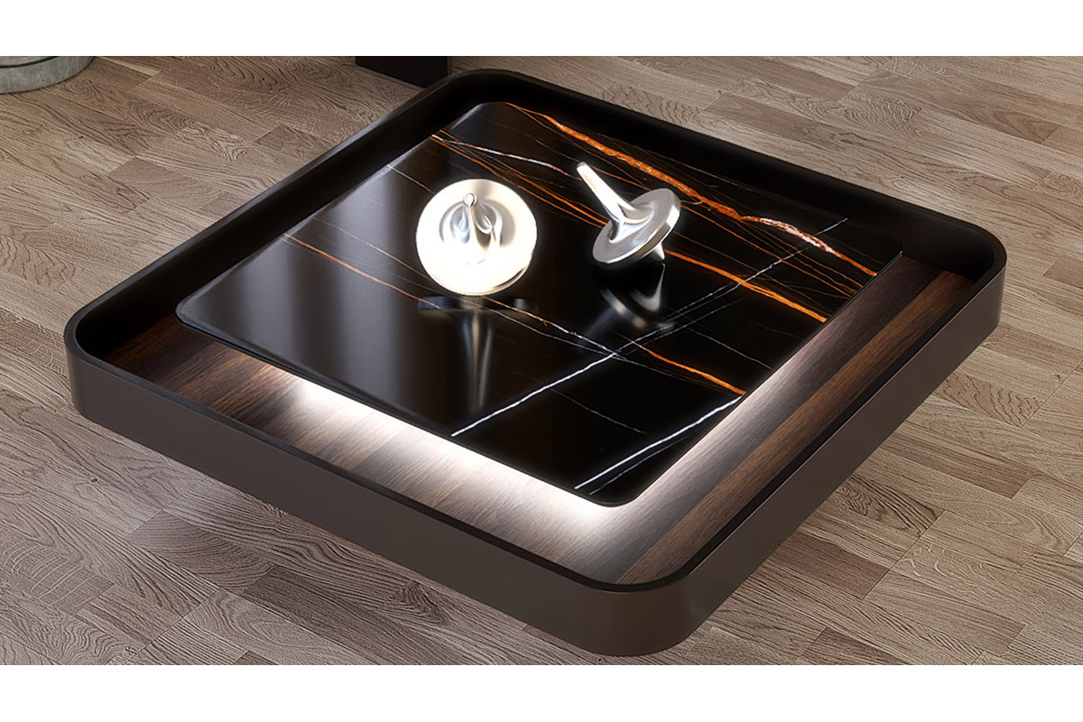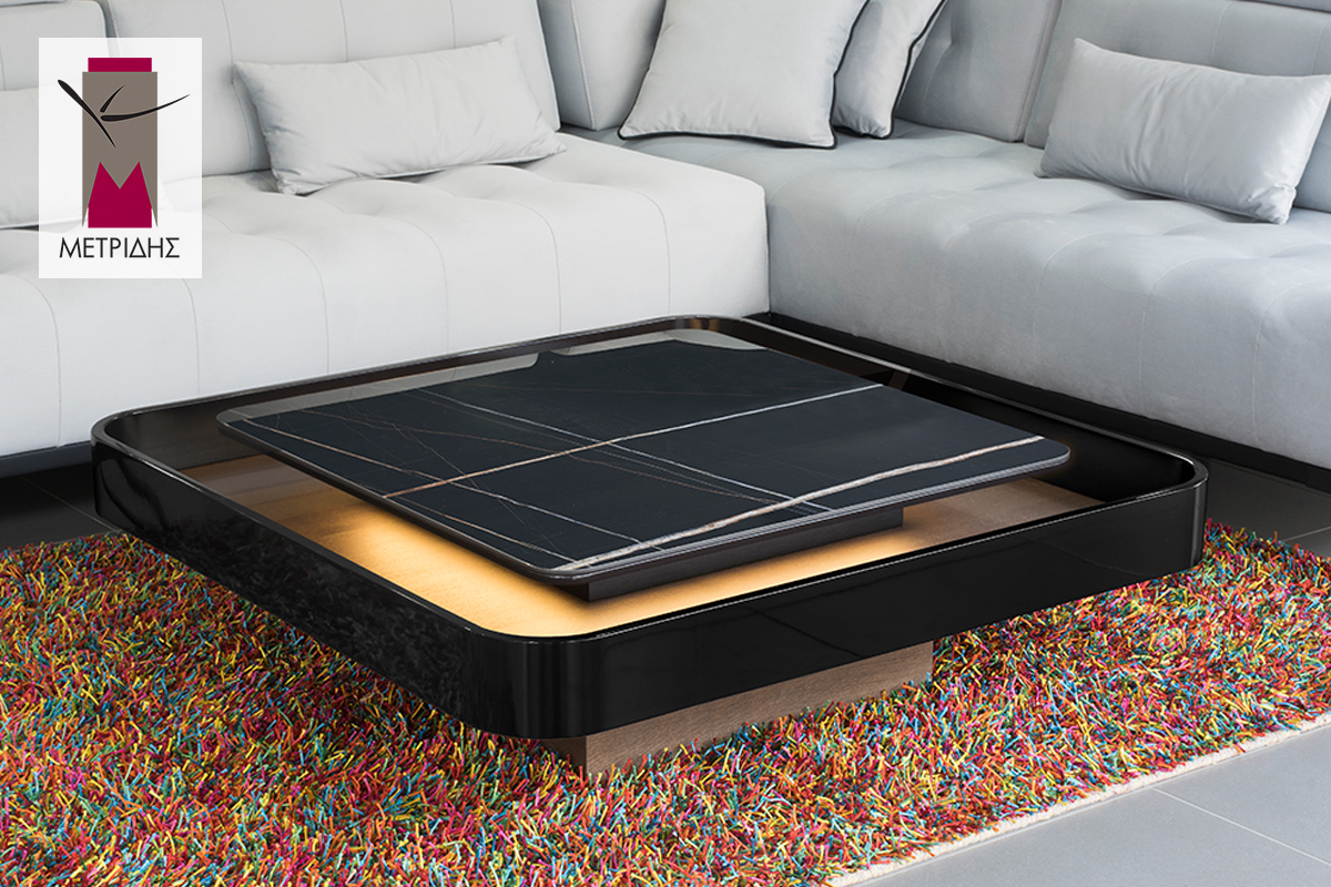 Τραπεζάκι σαλονιού Marble. Ένα μοντέλο ιδιαίτερου σχεδιασμού που συνδυάζει το ξύλο ευκάλυπτου, το χρώμα λάκας, καθώς και το μοναδικό ύφος που προσφέρει ο κεραμικό. Ο κρυφός του φωτισμός του παρέχει μια μοναδική ατμόσφαιρα. Κατασκευάζεται σε διαστάσεις, υλικά και χρώματα της επιλογής σας