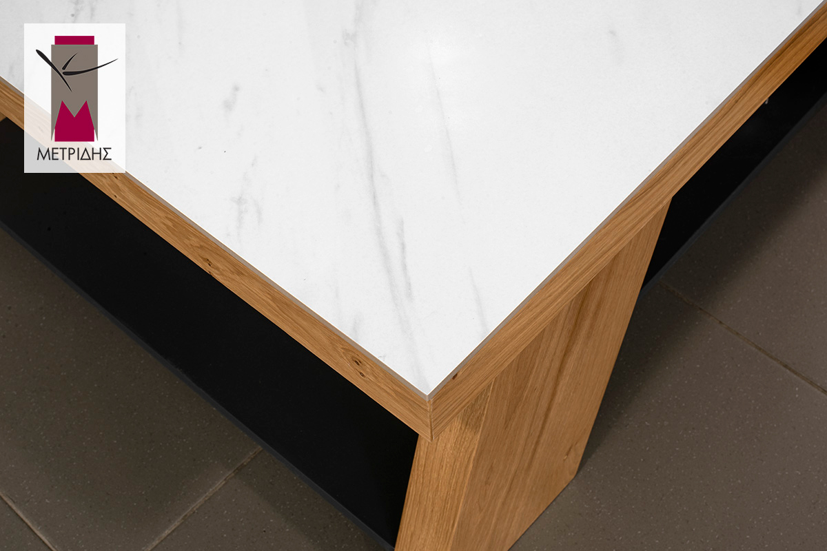 Το καπάκι του τραπεζιού Native είναι επενδυμένο με κεραμικό υλικό, προσθέτοντας μια μοντέρνα πινελιά στο σύνολο. Το κεραμικό υλικό προσφέρει ανθεκτικότητα στην φθορά και ευκολία στη συντήρηση, ενώ ταυτόχρονα διατηρεί την κομψότητα του design.