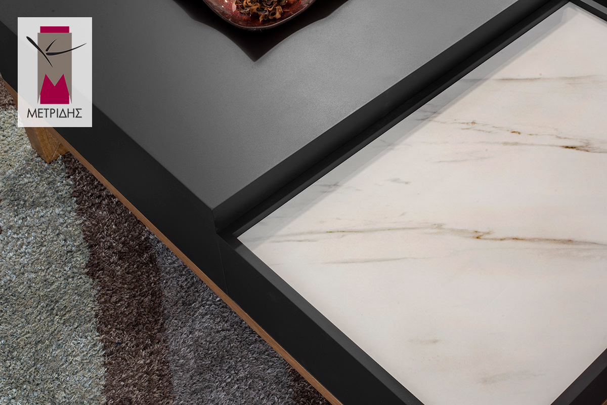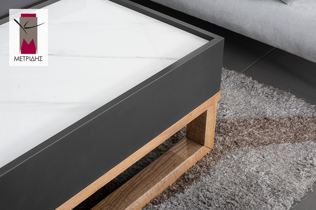 Το κεραμικό στο καπάκι, που επικαλύπτει την επιφάνεια του τραπεζιού, προσθέτει μια διακριτική πινελιά πολυτέλειας. Η λεία υφή του κεραμικού δημιουργεί ένα ανθεκτικό και εύκολο στη φροντίδα επιφανειακό στρώμα, κατάλληλο για την τοποθέτηση ποτηριών, βιβλίων και άλλων αξεσουάρ.