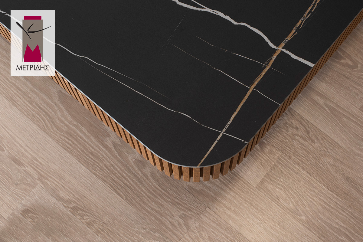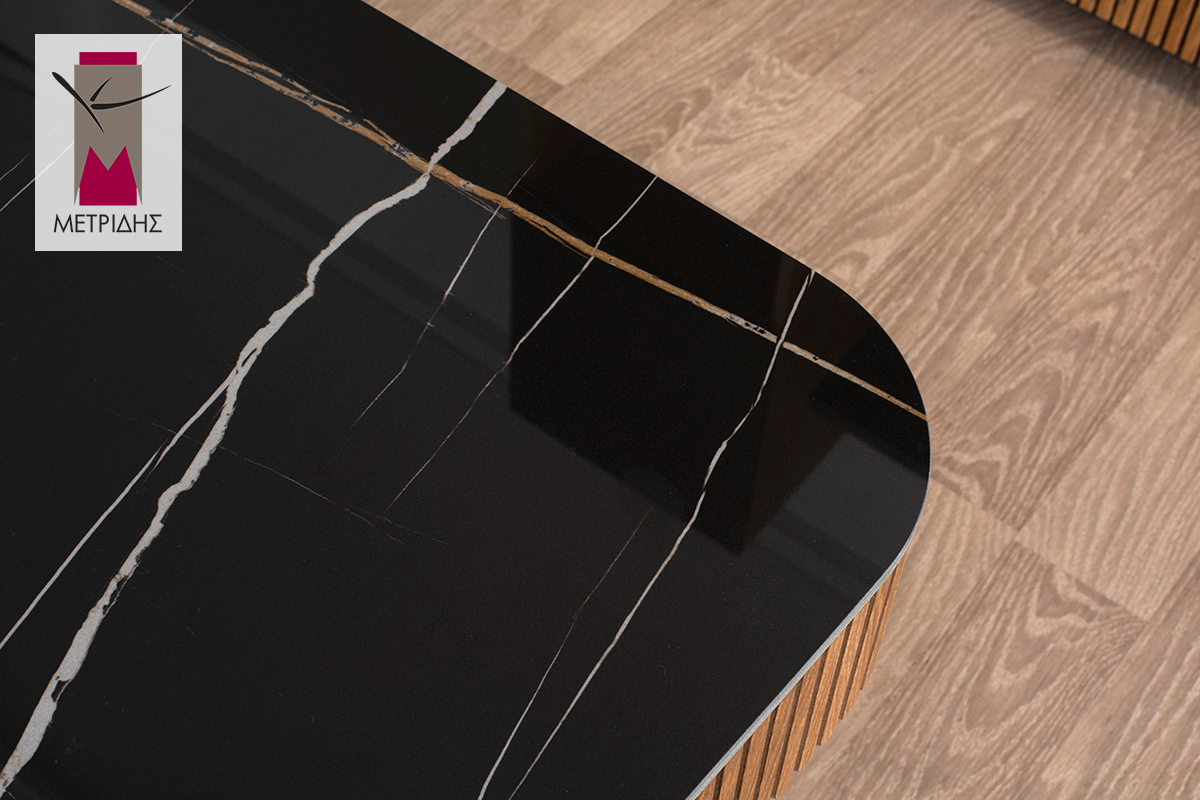 Η επιφάνεια καλύπτεται από ανθεκτικό κεραμικό υλικό σε μαύρη απόχρωση με φυσικές λευκές φλέβες, προσφέροντας πολυτέλεια και ευκολία στον καθαρισμό.